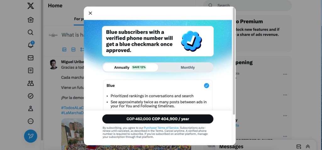 Precisamente, esta decisión ya está en marcha y quienes quieran acceder al servicio, que ahora se llama X Pro, recibían un mensaje que les requería pagar 84 dólares al año (unos 344.100 pesos colombianos) para tener la verificación (es decir con la marca azul).