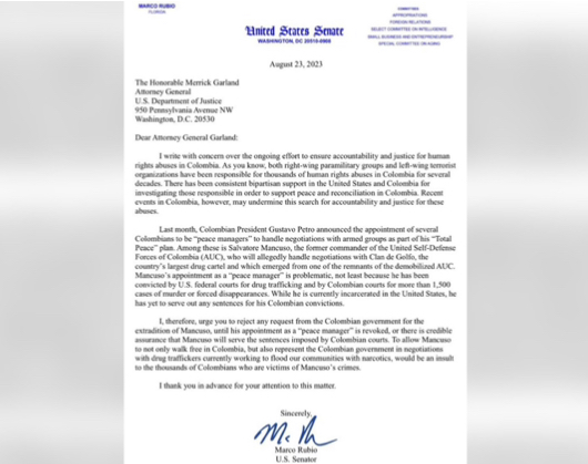 Entre tanto, en su página web, el congresista justificó la solicitud al Fiscal Estadounidense: «El 23 de julio del 2023, el presidente colombiano Gustavo Petro nombró al líder paramilitar Salvatore Mancuso como “gestor de paz” para negociar con uno de los cárteles de droga más grandes del país».