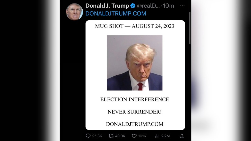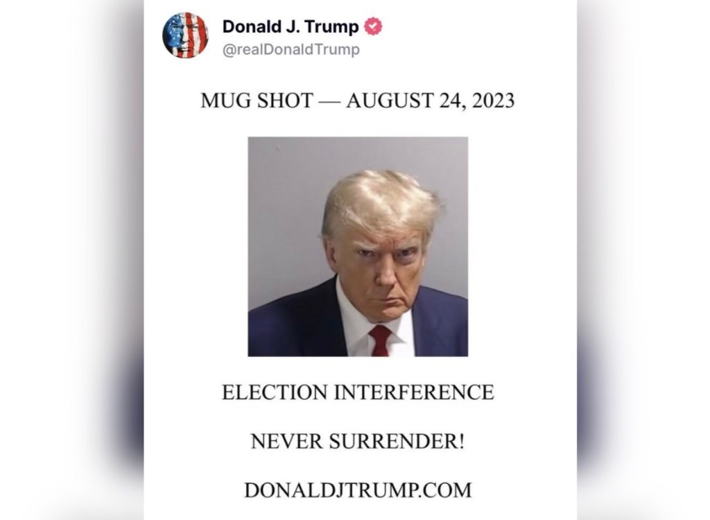 Luego de pagar una fianza de 200.000 dólares abandonó el centro penitenciario no sin antes tomarse la foto correspondiente de reseña que compartió en redes sociales, tanto en su propia red social Truth Social, como el Twitter (ahora X).