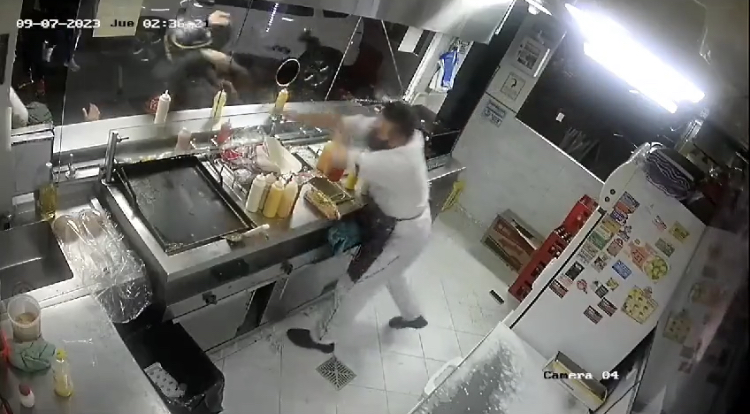 Una vez despojados los clientes de sus pertenencias, uno de los delincuentes con el casco puesto y con el arma en la mano, amenaza al trabajador que aparece desde el inicio en las imágenes y quien utiliza tapabocas.