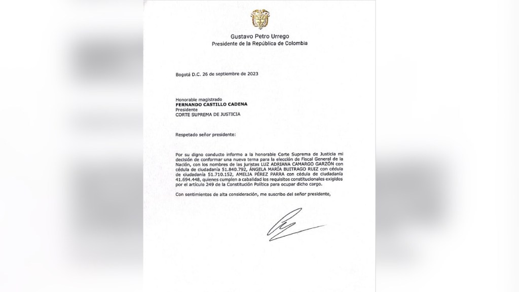 Por su parte, la Corte Suprema de Justicia informó en su cuenta en X (Twitter): «El presidente de la República, Gustavo Petro Urrego entrega a la Corte Suprema de Justicia una nueva terna para la elección de Fiscal General de la Nación, integrada por las juristas Luz Adriana Camargo Garzón, Ángela María Buitrago Ruiz y Amelia Pérez Parra».