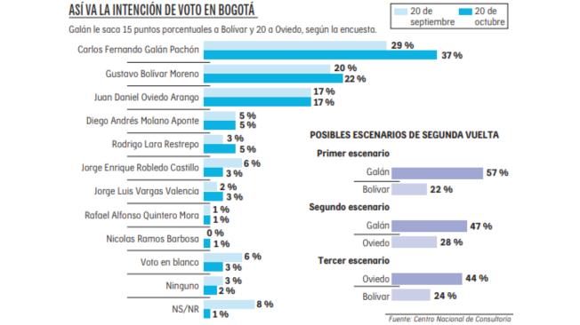Según los resultados de esta encuesta, Galán escaló de 29 a 37 %, superando en 15 puntos porcentuales al candidato del Pacto Histórico Gustavo Bolívar. Entre las dos últimas mediciones subió dos puntos (de 20 a 22 por ciento) y sigue ubicado en el segundo puesto.