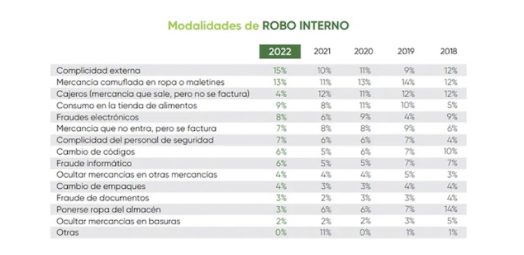 Así mismo, mercancía que no entra pero se factura, complicidad de personal de seguridad, 7%, cambio de códigos 6 %, fraude informático 6 %, ocultar mercancías en otras mercancías 4 %, cambio de empaques 4 %, fraude de documentos 3 %, ponerse ropa del almacén 3 %, ocultar mercancías en basuras 2 % y otras 0%.