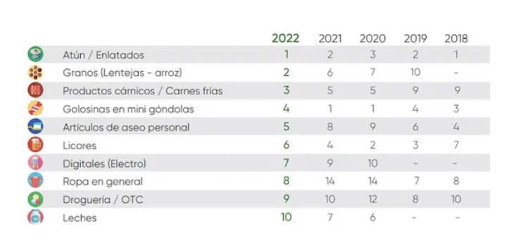 Entre los productos que más se roban en supermercados se encuentran atún y enlatados; por granos (lenteja-arroz); productos cárnicos; golosinas en minigóndolas; artículos de aseo personal; licores; digitales(electro); ropa en general; droguería/OTC y leches.