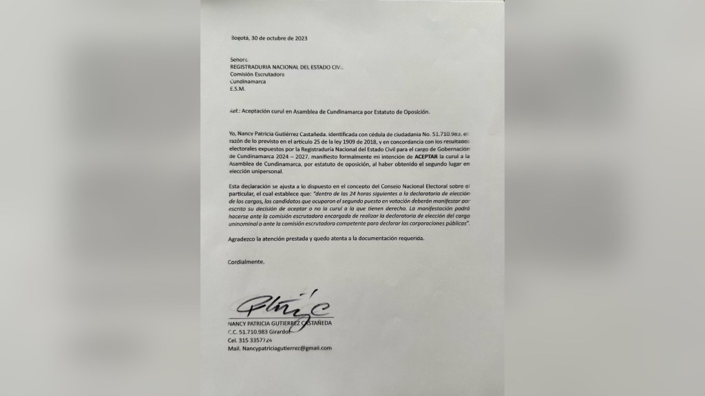 Así lo hizo saber a través de una carta enviada a la Registraduría Nacional del Estado Civil, en la que señaló que en concordancia con los resultados electorales “manifiesto formalmente mi intención de aceptar la curul a la Asamblea de Cundinamarca”.