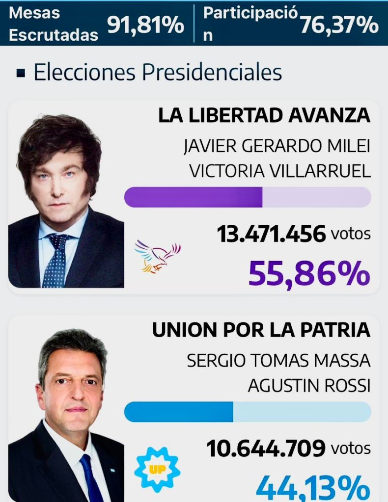 Previo al termino de la jornada electoral, se conocieron resultados a boca de urna que dieron como resultado una ventaja al candidato Javier Milei con 53,6 % frente al ministro de Economía, Sergio Massa con un 46,33 %.