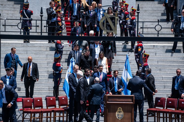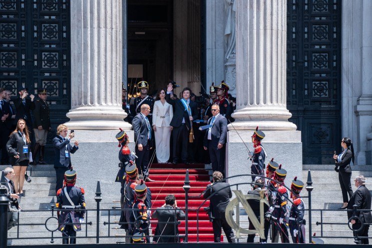 Milei fue recibido entre gritos de «¡Argentina, Argentina!», Milei y su flamante vicepresidenta, Victoria Villarruel, con los que proclamaron su lealtad al Estado argentino en presencia de sus predecesores, Alberto Fernández y Cristina Kirchner.