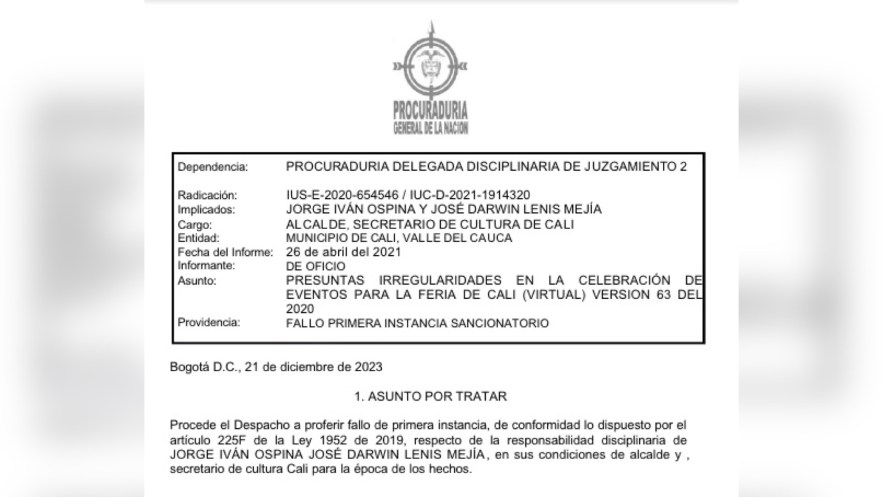 El Ministerio Público determinó que como delegante, el alcalde Ospina no realizó vigilancia, control y seguimiento sobre las actividades adelantadas por el secretario de Cultura para determinar la cuantía del futuro convenio, ni asumió la responsabilidad que le correspondía como ordenador natural del gasto, permitiendo con ello “la realización de un proceso contractual contrario a derecho por parte de su delegado, el secretario de cultura de Cali”.