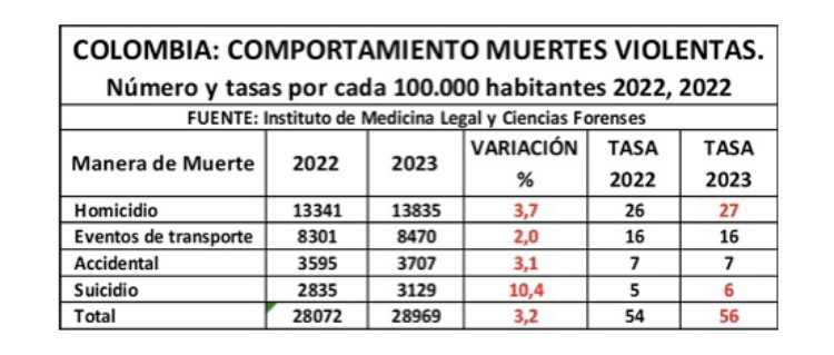 Según cifras de Medicina Legal, los homicidios en Colombia crecieron en un 3,7 % y la tasa por cada 100.000 habitantes se ubicó en 27; las muertes en siniestros viales aumentaron en 2 %, los suicidios aumentaron en 10,4 % y las muertes accidentales en 3,2 %.