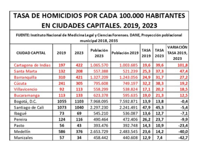 En ese sentido, sobresale Cartagena, que durante la pasada administración duplicó la cifra de homicidios, su tasa pasó de 19,6 homicidios por cada 100.000 habitantes en 2019 a 39,6 en 2023, le siguen, en aumento, Santa Marta, con un crecimiento de su tasa en un 47,4 %, Barranquilla 27,2 %, Cúcuta 19,2 %, Villavicencio 18,5 % y Bucaramanga 12,5 %.