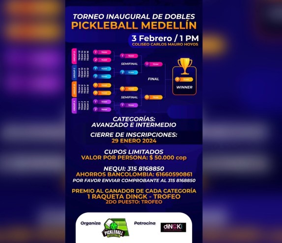 El Coliseo Carlos Mauro Hoyos de Medellín será escenario del primer torneo inaugural de dobles mixto de pickleball en las categorías superior e intermedia.