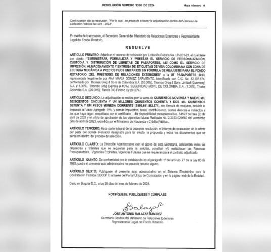 Mediante la Resolución número 1396 de 2024, del 26 de febrero de 2024, la Cancillería adjudicó el contrato para la elaboración de pasaportes a la firma Thomas Greg & Sons, con la que mantuvo una disputa legal al desconocer el proceso licitatorio que fue suspendido.
