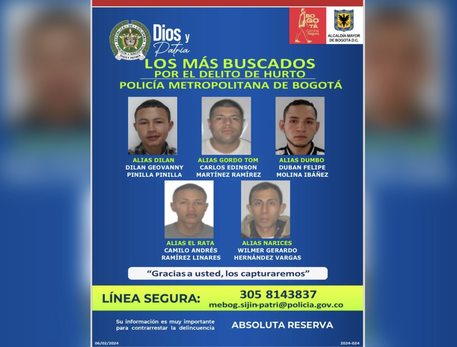 Debido al incremento de los casos de inseguridad en Bogotá, el alcalde, Carlos Fernando Galán, anunció, desde el Portal de las Américas, nuevas medidas de seguridad. Una de las primeras decisiones es el fortalecimiento del pie de fuerza de la Policía metropolitana con la llegada de otros 700 uniformados para reforzar la presencia en las … Continuar leyendo Este es el cartel de los delincuentes más buscados en Bogotá, alcalde anuncia nuevas medidas ante incremento de la inseguridad