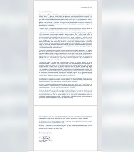 Precisamente, se conoció un comunicado en el que expresó que llega al país a aportarle a la paz y a cumplirle a las víctimas.