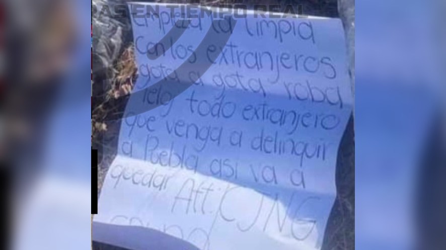 En el escrito dejado, al parecer, por miembros del grupo delincuencial CJNG, (Cartel Jalisco Nueva Generación), los acusa de ser supuestamente «extranjeros gota a gota» y «roba reloj».