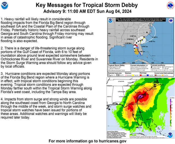 El Centro Nacional de Huracanes advirtió que «se espera que Debby se fortalezca rápidamente hasta convertirse en huracán antes de tocar tierra en el área de Big Bend de Florida. Gran amenaza de inundaciones para el sureste de Estados Unidos».