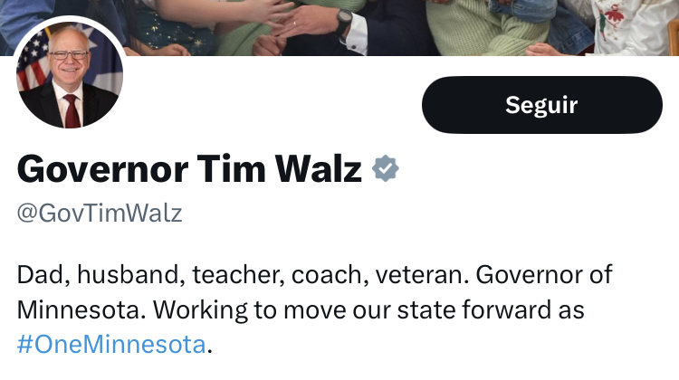 Walz de 60 años, se describe en su cuenta oficial de X como “Papá, esposo, entrenador, veterano, Gobernador de Minnesota. Trabajando para sacar adelante nuestro estado como Un Minnesota».