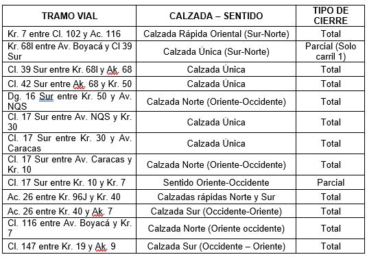 Los siguientes son los tramos, calzadas y sentidos que tendrán cierres totales o parciales: