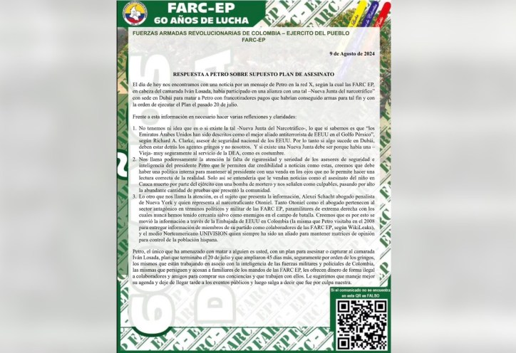 De acuerdo con la organización armada ilegal, «la falta de rigurosidad seria por parte de los asesores de seguridad e inteligencia del presidente Petro, que le permiten dar credibilidad a informaciones como esas».