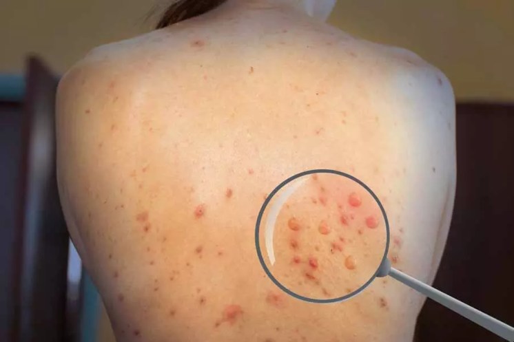 - Una fase de brote en la que aparecen manchas, granos, vesículas, vesículas llenas de pus y costras en la piel, principalmente en la cara, manos y pies, o en las áreas de contacto estrecho durante una relación sexual, siendo contagiosos los casos hasta que todas las lesiones hayan cicatrizado.