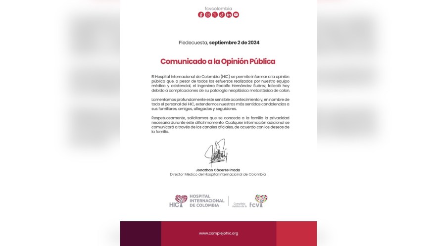 El exalcalde de Bucaramanga y excandidato presidencial, Rodolfo Hernández Suárez, falleció a sus 79 años de edad en el Hospital Internacional de Colombia, HIC, debido a las complicaciones de salud.