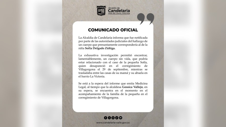 “La exhaustiva investigación permitió encontrar, lamentablemente, un cuerpo sin vida, que podría estar relacionado con el caso de la pequeña Sofía, quien desapareció en el corregimiento de Villagorgona el 29 de septiembre, mientras se trasladaba entre las casas de su mamá y su abuela en el barrio La Victoria”, señaló el despacho a través de un comunicado.