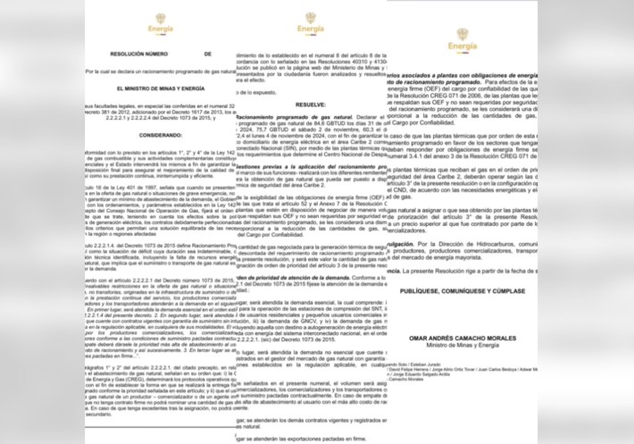 “Esta es la confirmación de que se declara un racionamiento. Sin embargo, es un poco confuso porque no se determina cuáles son las fuentes de gas que van a tener una limitación y además le pide casi que el favor a las plantas térmicas de que no usen gas cuando estas tienen que cumplir sus obligaciones de energía en firme y si no las cumplen afectan a los usuarios de energía eléctrica”, enfatizó.