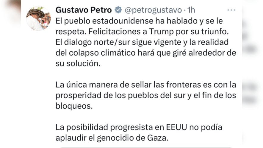 Al referirse al triunfo de Trump en las elecciones presidenciales, el jefe de Estado colombiano señaló: “El pueblo estadounidense ha hablado y se le respeta. Felicitaciones a Trump por su triunfo”