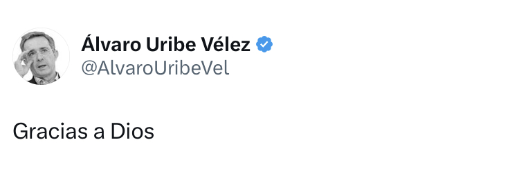 En un breve mensaje, el expresidente Álvaro Uribe Vélez se refirió a la decisión judicial señalando: “Gracias a Dios”.
