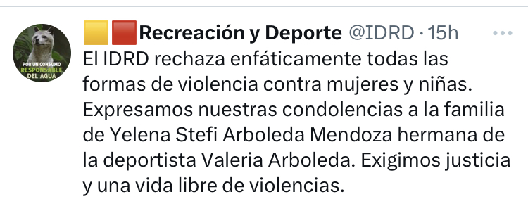 Entre tanto, el Instituto Distrital de Recreación y Deporte, IDRD, de Bogotá condenó «la violencia contra la vida de Yelena Stefi Arboleda Mendoza» tras expresar sus condolencias a los seres allegados.