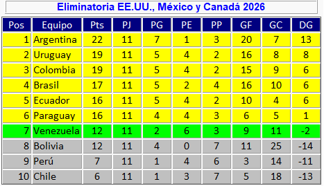 De esta manera, Uruguay desplaza a Colombia del segundo puesto de la clasificación, aunque ambos tienen 19 puntos, a tres de la líder Argentina.