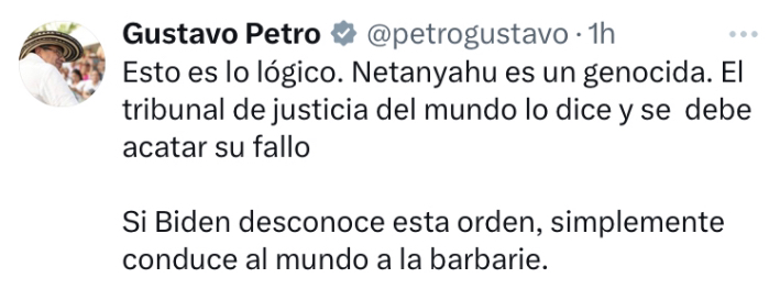 Tras la decisión de la CPI, el presidente, Gustavo Petro escribió en su cuenta en X, en la que la calificó como lógica e insistió en sus fuertes pronunciamientos contra el primer ministro israelí.