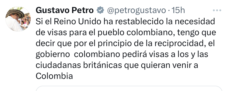 «Si el Reino Unido ha restablecido la necesidad de visas para el pueblo colombiano, tengo que decir que, por el principio de la reciprocidad, el gobierno colombiano pedirá visas a los y las ciudadanas británicas que quieran venir a Colombia», aseguró el jefe de Estado.