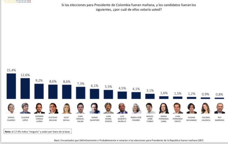 De acuerdo con la medición, le siguen Claudia López con 12,6 %, Germán Vargas Lleras con 9,2 %; Gustavo Bolívar y Vicky Dávila con 8,6 % cada uno, Juan Manuel Galán con 7,3 % y Daniel Quintero con 6,1 %.