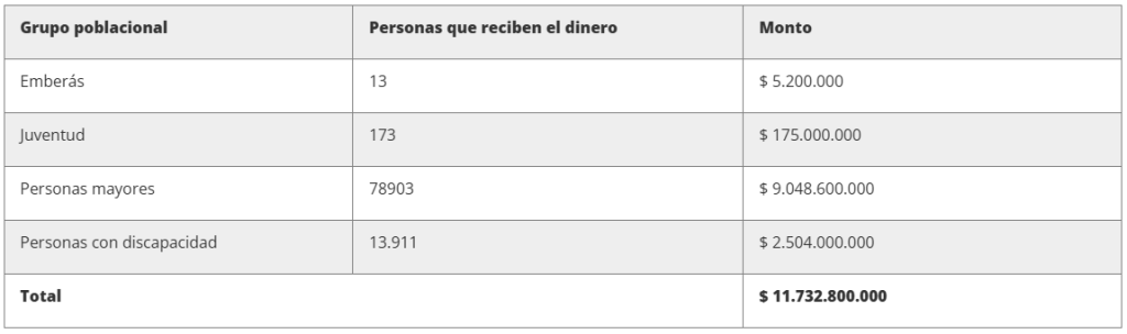 Se trata del segundo ciclo de pagos del año, para lo cual se destinarán más de 43.000 millones de pesos, ya que se incluirán más de 93.000 personas que recibirán apoyos en los distintos componentes dirigidos a titulares únicos en IMG (personas con discapacidad, personas mayores, jóvenes y miembros del pueblo emberá que retornaron a su territorio).