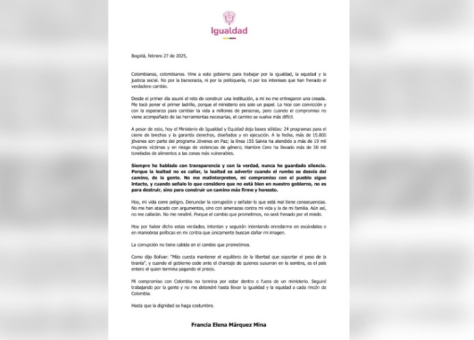 En carta pública que publicó en redes sociales aseguró que llegó al gobierno Petro «para trabajar por la igualdad, la equidad y la justicia social, no por la burocracia, ni por la politiquería, ni por los intereses que han frenado el verdadero cambio».