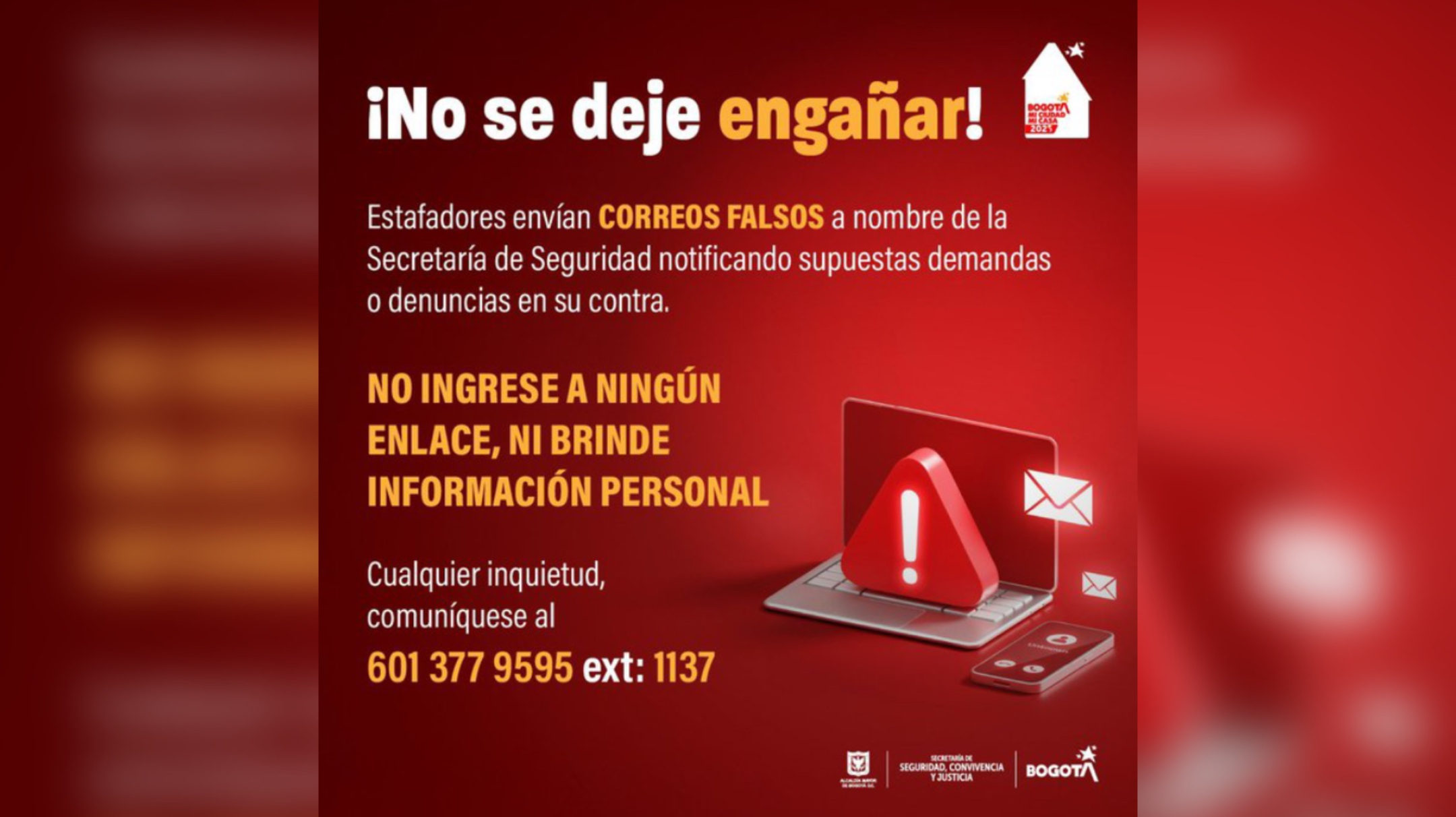 La Secretaría Distrital de Seguridad, Convivencia y Justicia, SDSCJ, denunció que personas inescrupulosas están enviando correos a nombre de esa entidad afirmando que existen denuncias o demandas en contra de los ciudadanos, con falsos enlaces para estafar.