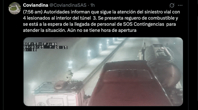 «Autoridades informan que sigue la atención del siniestro vial con 4 lesionados al interior del túnel 3. Se presenta reguero de combustible», indicó en su cuenta en X.