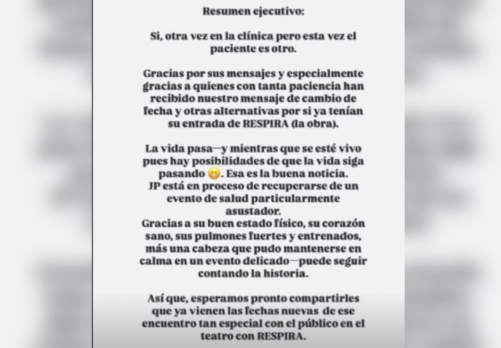 “La vida pasa, y mientras se esté vivo pues hay posibilidades de que la vida siga pasando. Esa es la buena noticia. JP está en proceso de recuperarse de un evento de salud particularmente asustador”, escribió la esposa del artista.
