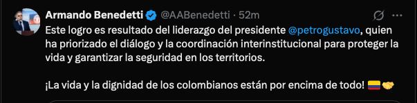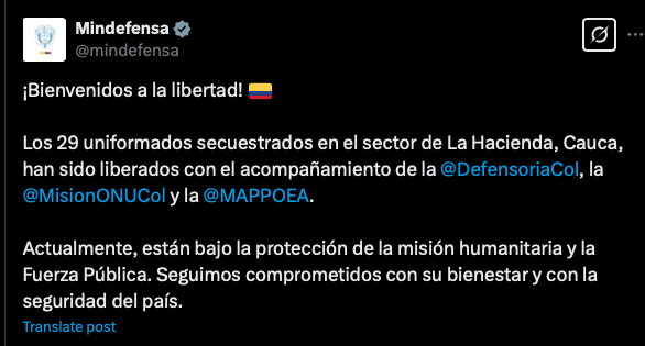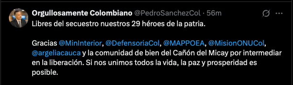 Previamente, en otra publicación señaló: «¡Los 28 policías y el militar secuestrados en zona rural de El Plateado, Cauca, han sido liberados!».