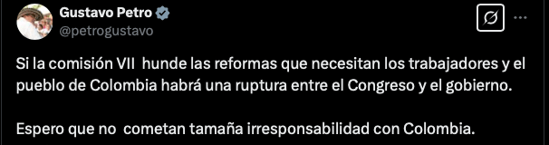 “Si la Comisión Séptima hunde las reformas que necesitan los trabajadores y el pueblo de Colombia, habrá una ruptura entre el Congreso y el Gobierno. Espero que no cometan tamaña irresponsabilidad con Colombia”, advirtió.