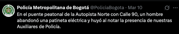 Según el reporte, auxiliares de Policía que adelantaban labores de verificación y control por la Autopista Norte con Calle 90, observaron a un ciudadano movilizándose en una patineta eléctrica, quien al notar la presencia de los uniformados abandona este elemento y emprende la huida.
