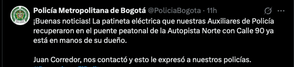 Tras el llamado de las autoridades, se hizo presente el propietario de la patineta eléctrica, Juan Corredor a quien le fue devuelta.