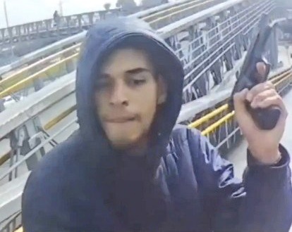 En ese momento, aparece el antisocial corriendo y con un arma en la mano, amenazándolo para que le entregue la patineta eléctrica.