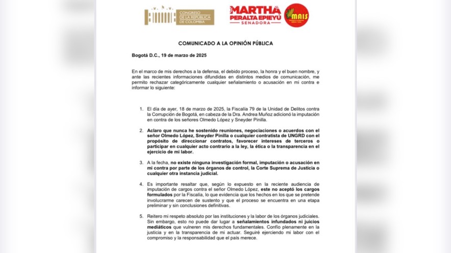 Por su parte, la congresista expidió un comunicado de prensa en el que señaló: «Aclaro que nunca he sostenido reuniones, negociaciones o acuerdos con el señor Olmedo López, Sneyder Pinilla o cualquier contratista de UNGRD con el propósito de direccionar contratos, favorecer intereses de terceros o participar en cualquier acto contrario a la ley, la ética o la transparencia en el ejercicio de mi labor».
