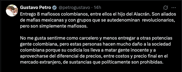 Por su parte, el presidente, Gustavo Petro, manifestó a través de su perfil en la red social X que entregó a las autoridades estadounidenses a «ocho mafiosos colombianos» que son «aliados de mafias mexicanas y con grupos que se autodenominan revolucionarios, pero son simplemente mafiosos».