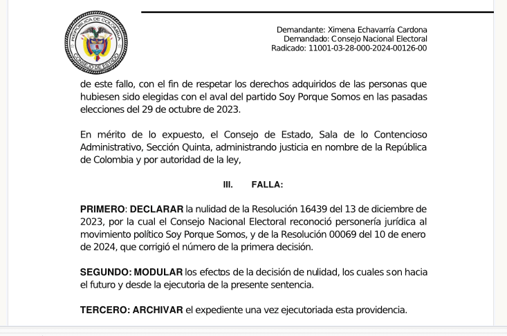 La Sección Quinta del Consejo de Estado declaró nula la Resolución 16439 del 13 de diciembre de 2023 en la cual Consejo Nacional Electoral, CNE, le otorgó personería jurídica al movimiento político Soy Porque Somos, movimiento político de la vicepresidenta de la República, Francia Márquez.