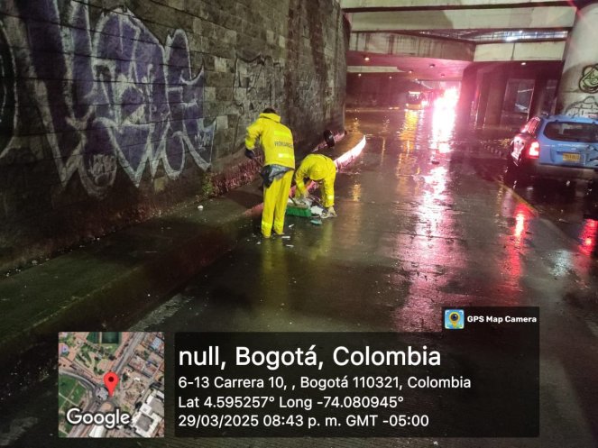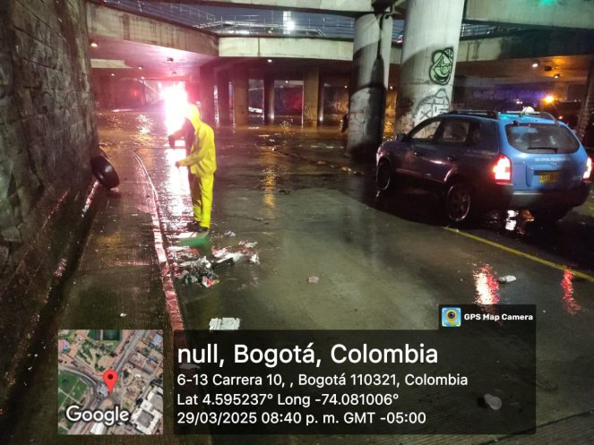 En el deprimido de la estación Bicentenario, en la carrera 10 con calle 6, equipos de la Empresa de Acueducto y Alcantarillado de Bogotá y del Cuerpo Oficial Bomberos trabajaron para retirar los residuos que taponan el sistema de alcantarillado e impidieron el drenaje de las aguas lluvias.