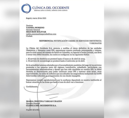 “La Clínica del Occidente anuncia y notifica el cierre definitivo de las unidades Obstetricia y Neonatos cómo IPS; expresamos nuestra profunda preocupación y tristeza, pero la crisis actual del sistema de Salud en Colombia, en especial el sector privado, nos lleva a tomar esta difícil decisión”, señaló en la misiva la gerente general de esa institución, María Cristina Vargas