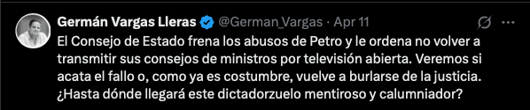 El exvicepresidente Germán Vargas Lleras se refirió a la extensa publicación de un mensaje del presidente Gustavo Petro en X sobre el fallo del Consejo de Estado que le ordena suspender las transmisiones del Consejo de Ministros a través de los canales privados.